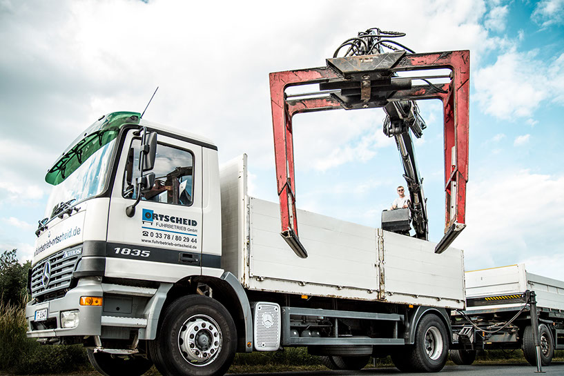 Zum Transport von Rohren, Betonteilen, Gartenhäusern usw. werden Fahrzeuge mit Ladehaken eingesetzt. Alle Fahrzeuge verfügen über Bordwände und besitzen leistungsstarke Kräne zur Entladung.